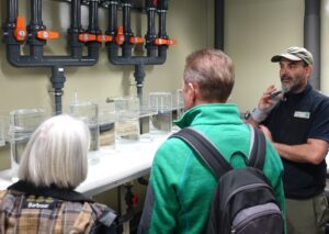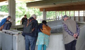 Wie geht es den Fischen und ihren Lebensräumen im Toggenburg? Um Antworten auf diese Frage zu erhalten, traf sich eine stattliche Gruppe interessierter Frauen und Männer im kantonalen Fischereizentrum in Steinach am Bodensee. Erfreulicherweise hat sich der kantonale Fischereiaufseher Christoph Mehr bereit erklärt, in die Thematik einzuführen. Mit rethorischem Geschick und einem enormen Fachwissen ist es ihm gelungen, die Besucherinnen und Besucher zu begeistern. Mit einer spannenden Präsentation erläuterte er zuerst die Aufgaben des Fischereizentrums und zeigte auch die komplexen Problemstellungen im Fischereiwesen auf. Damit waren die Grundlagen für ein besseres Verständnis während der anschliessenden Führung in den weitläufigen Zentrums-Anlagen geschaffen.